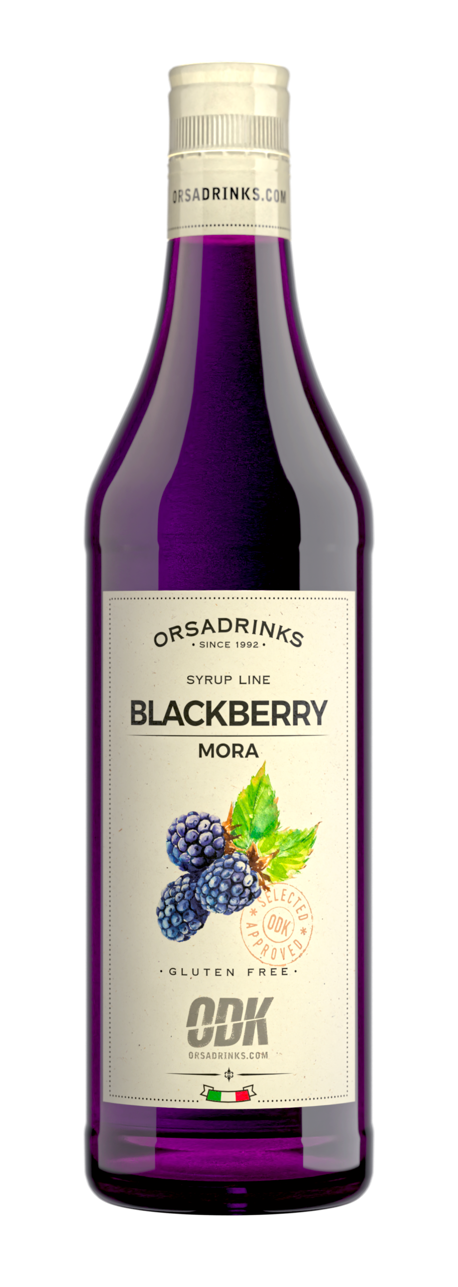 Bold blackberry syrup in a 750ml glass bottle. Rich berry flavor for cocktails, sodas, and dessert drinks.