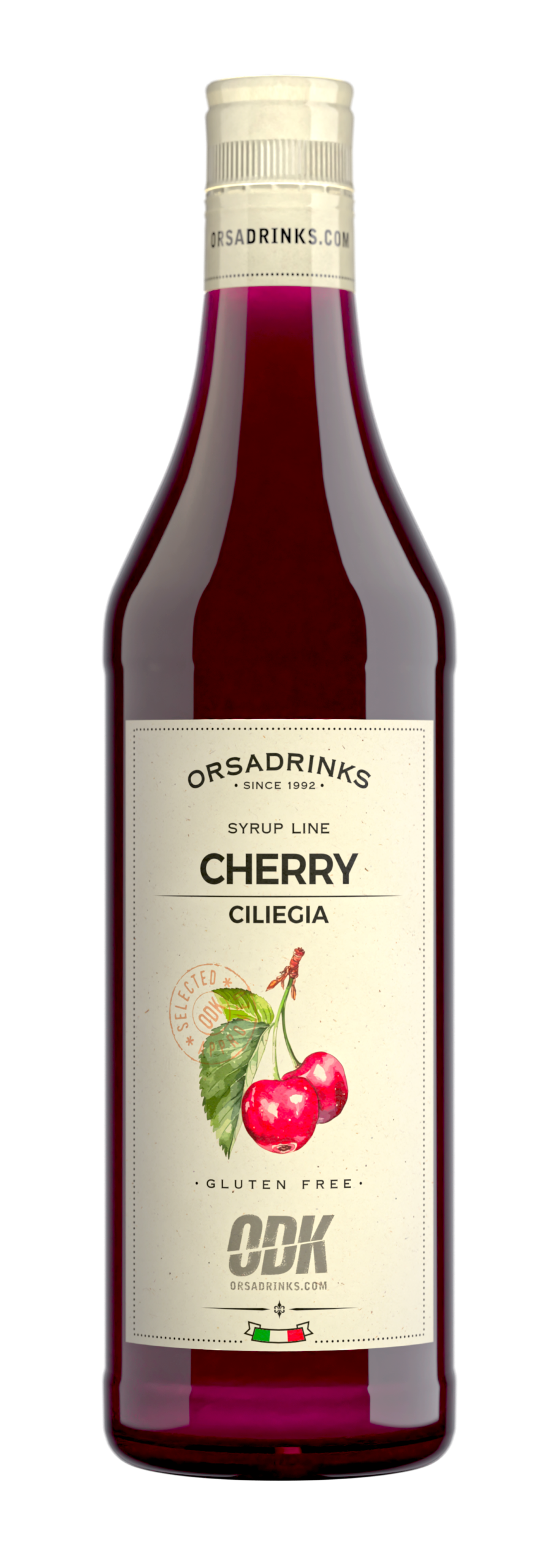 Sweet cherry syrup in a 750ml glass bottle.