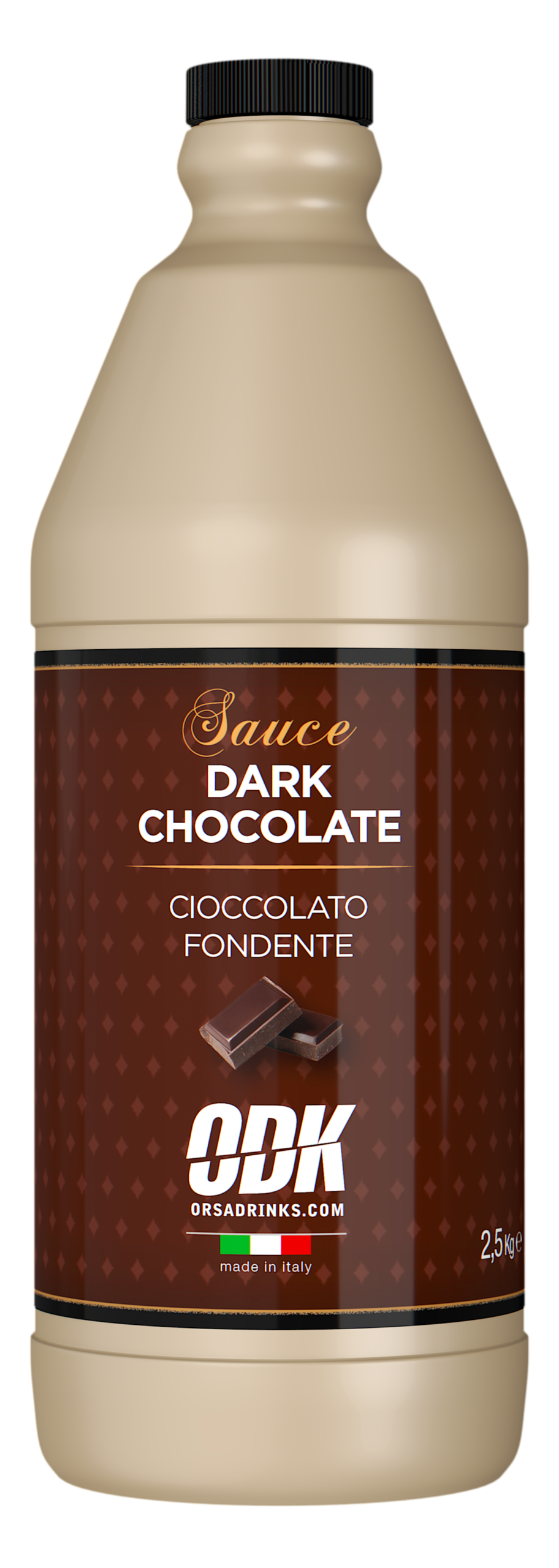 Premium dark chocolate topping sauce in a 1.9kg bottle. Rich, intense chocolate for drizzling and decorating. Professional quality from Orsa Drinks.