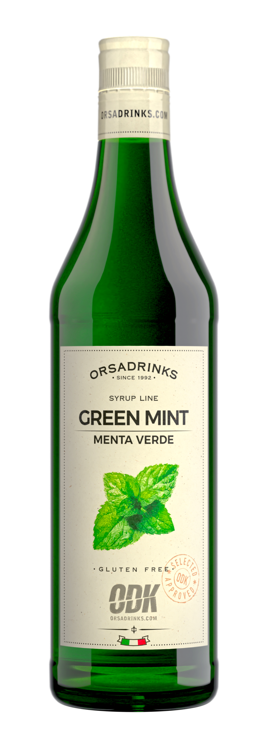 Vibrant green mint syrup in a 750ml glass bottle. Classic mint flavor with natural green color. Perfect for mojitos and mint juleps.