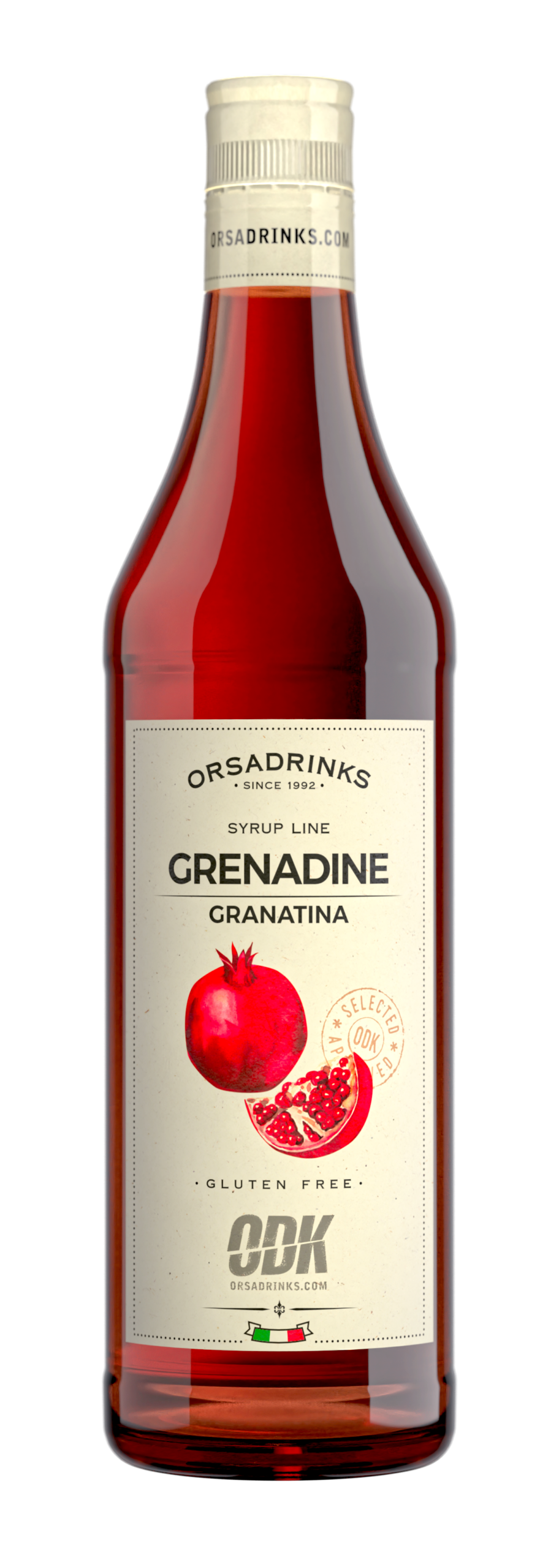 Classic grenadine syrup in a 750ml glass bottle. Adds vibrant color and sweet pomegranate flavor to cocktails, mocktails, and beverages. Premium quality from Orsa Drinks.