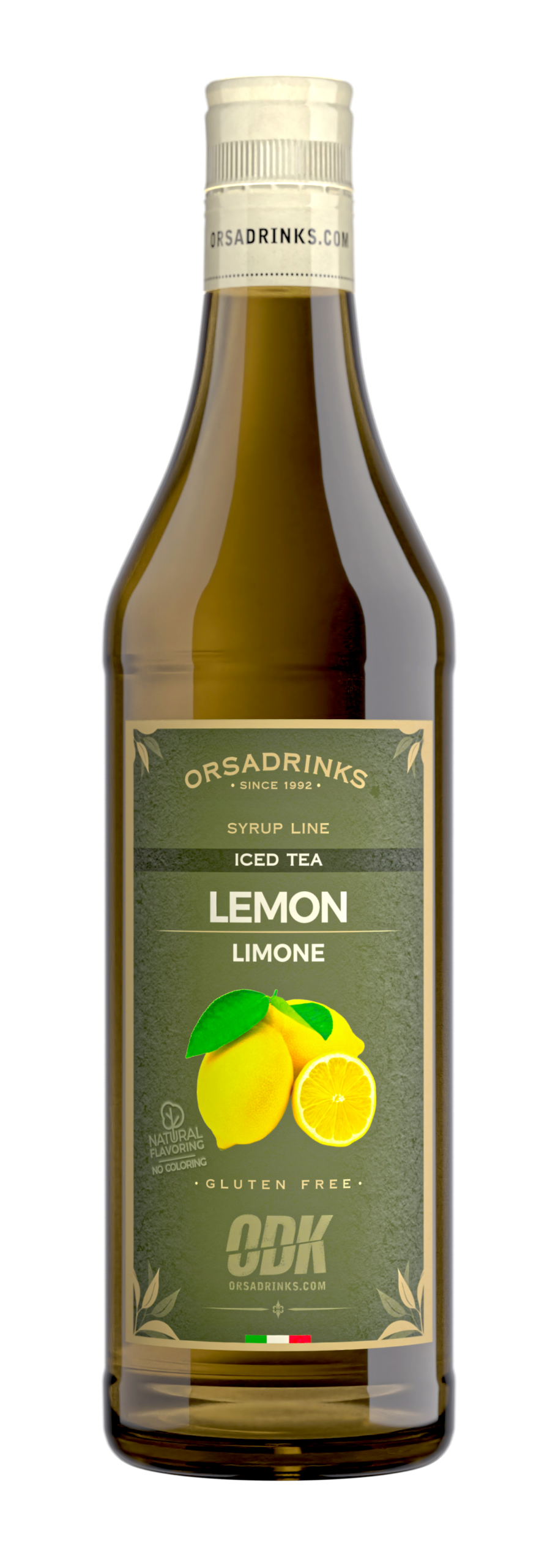 Lemon iced tea concentrate in a 1L bottle. Citrus-infused tea for refreshing beverages. Part of Orsa Drinks Iced Tea Line.