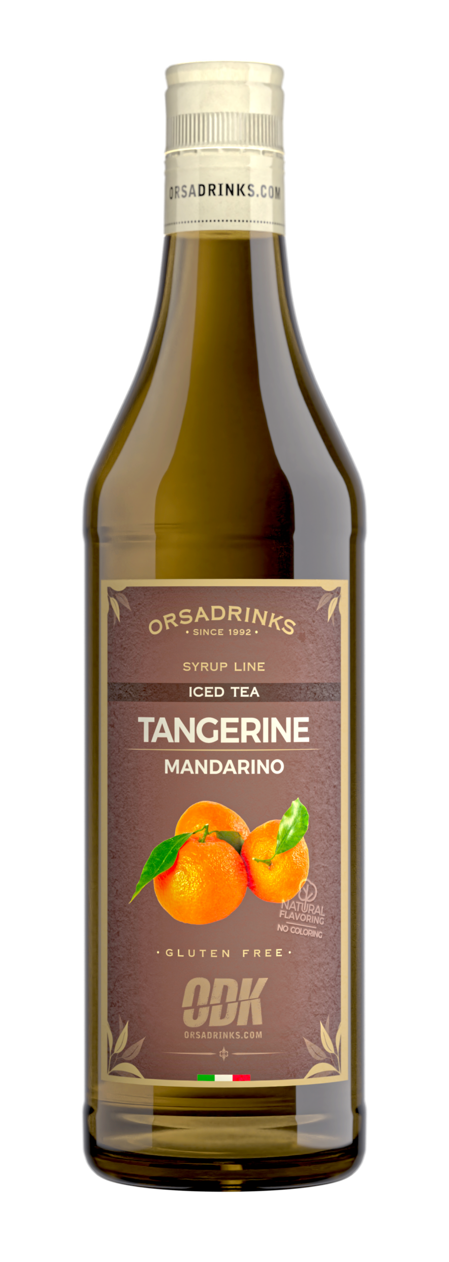 Mandarin iced tea concentrate in a 1L bottle. Citrus-infused tea with sweet mandarin flavor. Part of Orsa Drinks Iced Tea Line.