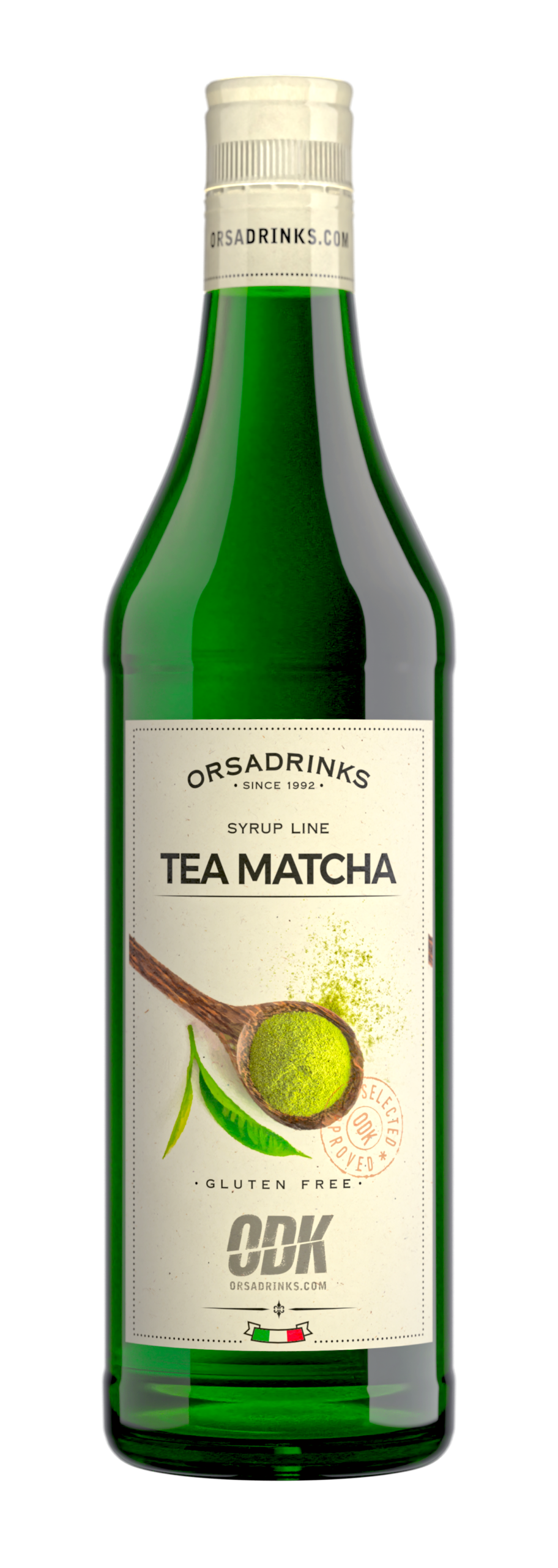 Premium matcha syrup in a 750ml glass bottle.