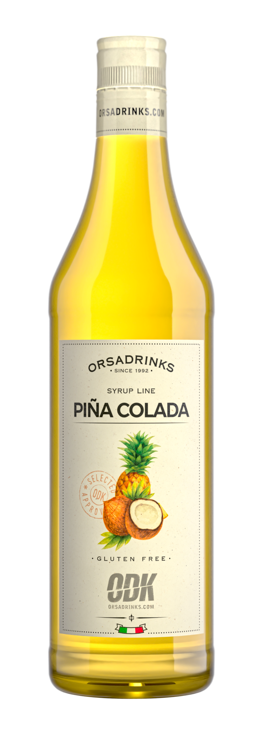 Tropical piña colada syrup in a 750ml glass bottle. Combines coconut and pineapple flavors for instant tropical drinks.
