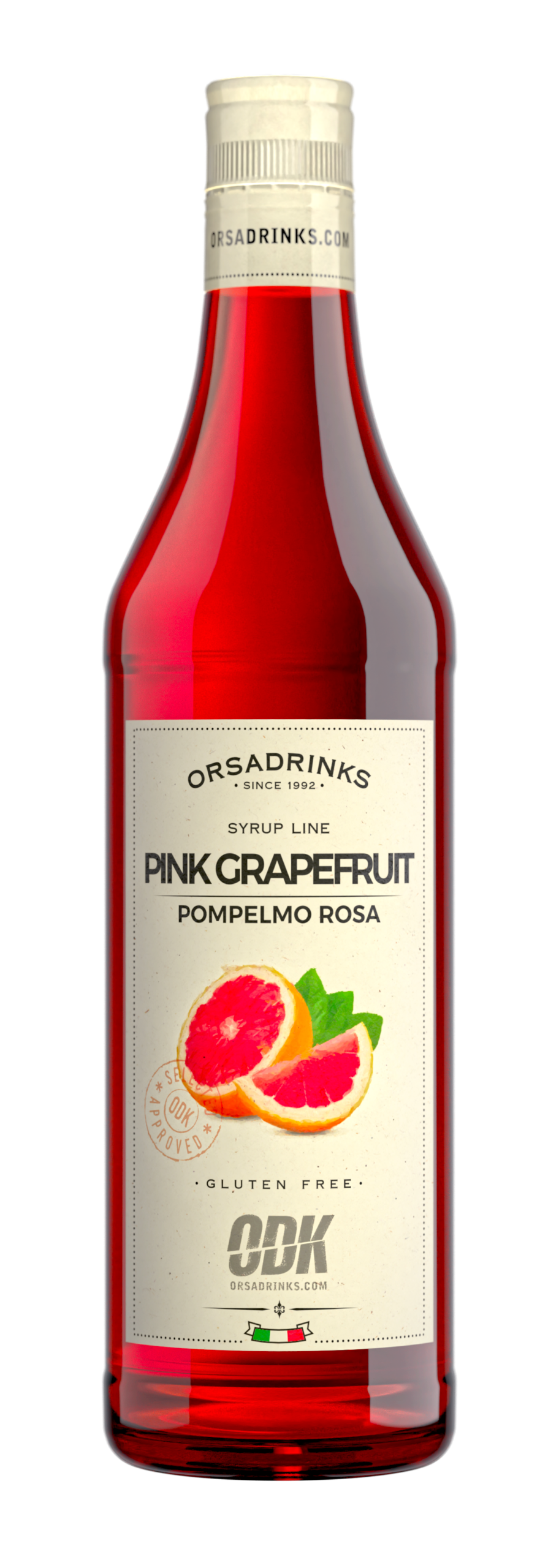 Tart pink grapefruit syrup in a 750ml glass bottle. Refreshing citrus flavor for cocktails and spa-inspired drinks.