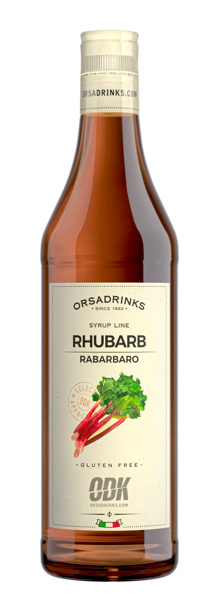 Tart rhubarb syrup in a 750ml glass bottle. Unique tangy-sweet flavor for creative cocktails and specialty drinks.