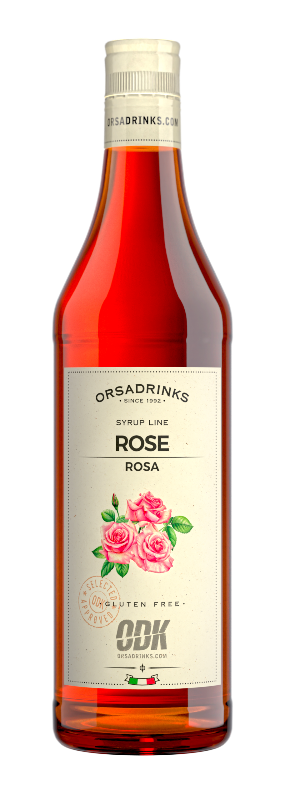 Elegant rose syrup in a 750ml glass bottle.