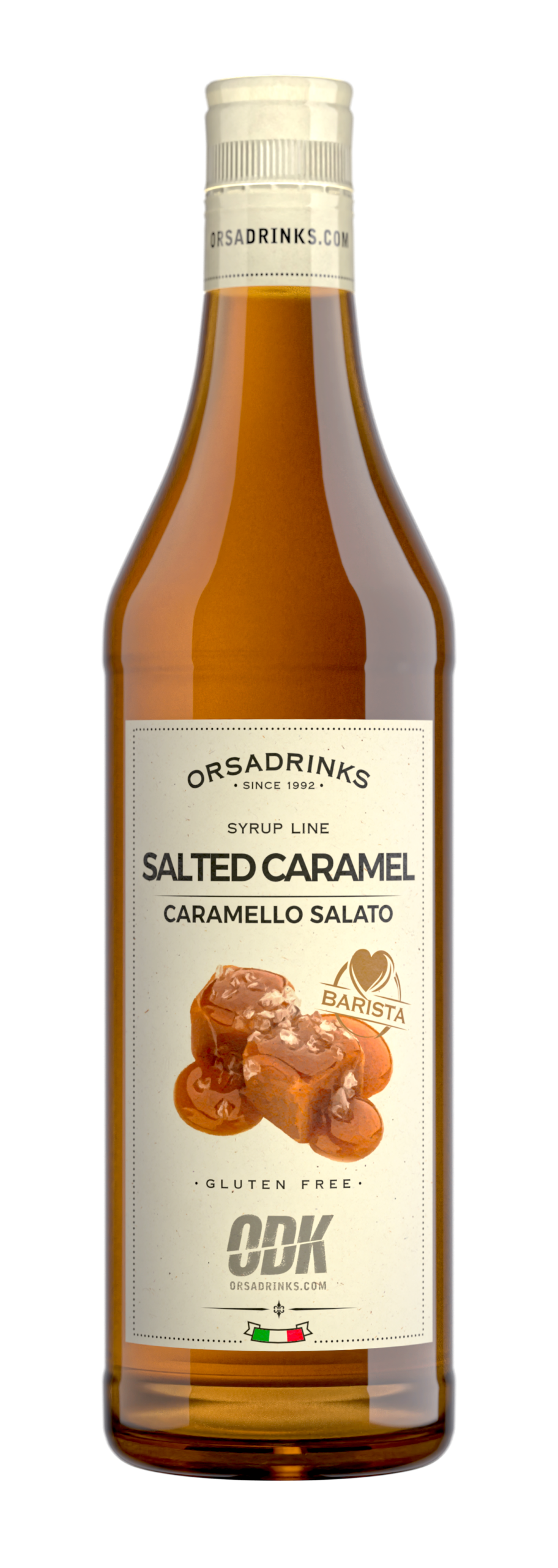 Indulgent salted caramel syrup in a 750ml glass bottle. Sweet and salty flavor combination for premium coffee drinks and frappes.