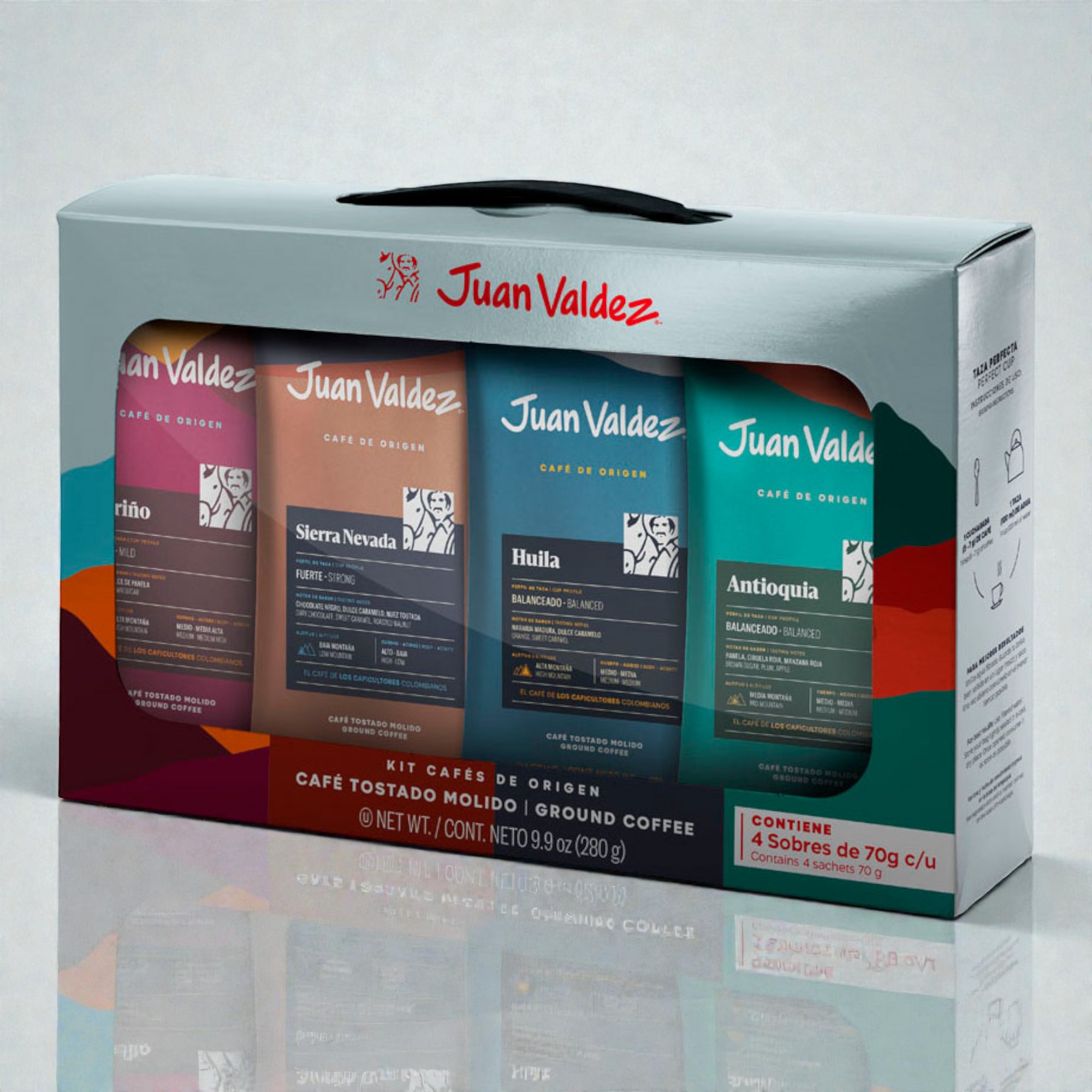 Single Origins Kit featuring 4 sachets of 70g ground coffee from different Colombian regions. Each sachet represents a unique origin with distinct flavor profiles. Total weight: 280g. 100% Colombian Arabica coffee, premium quality, naturally roasted. Perfect gift or variety pack.