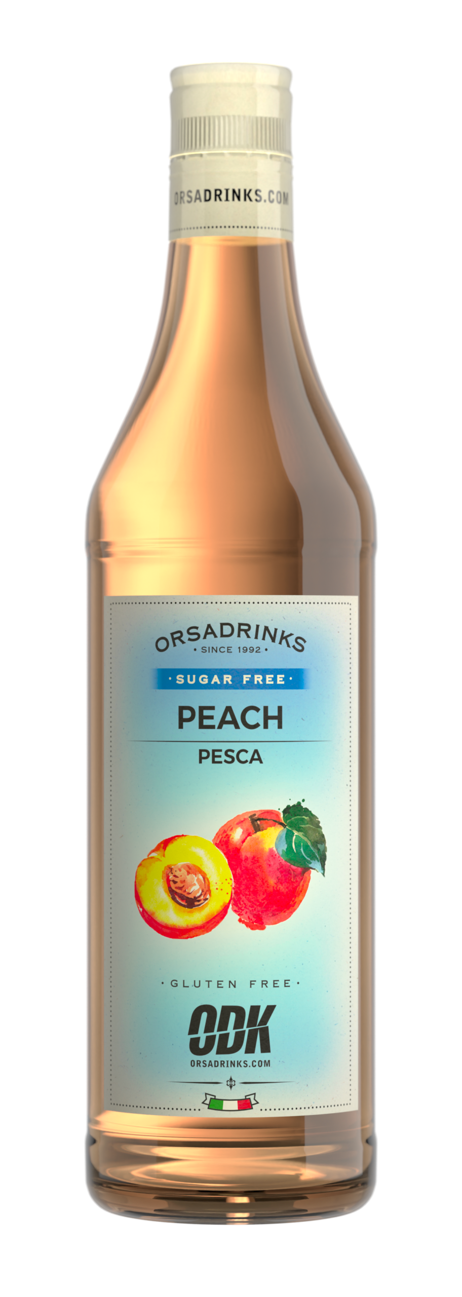 Sugar-free peach syrup in a 750ml glass bottle. Sweet peach flavor without the sugar. Perfect for health-conscious specialty drinks.
