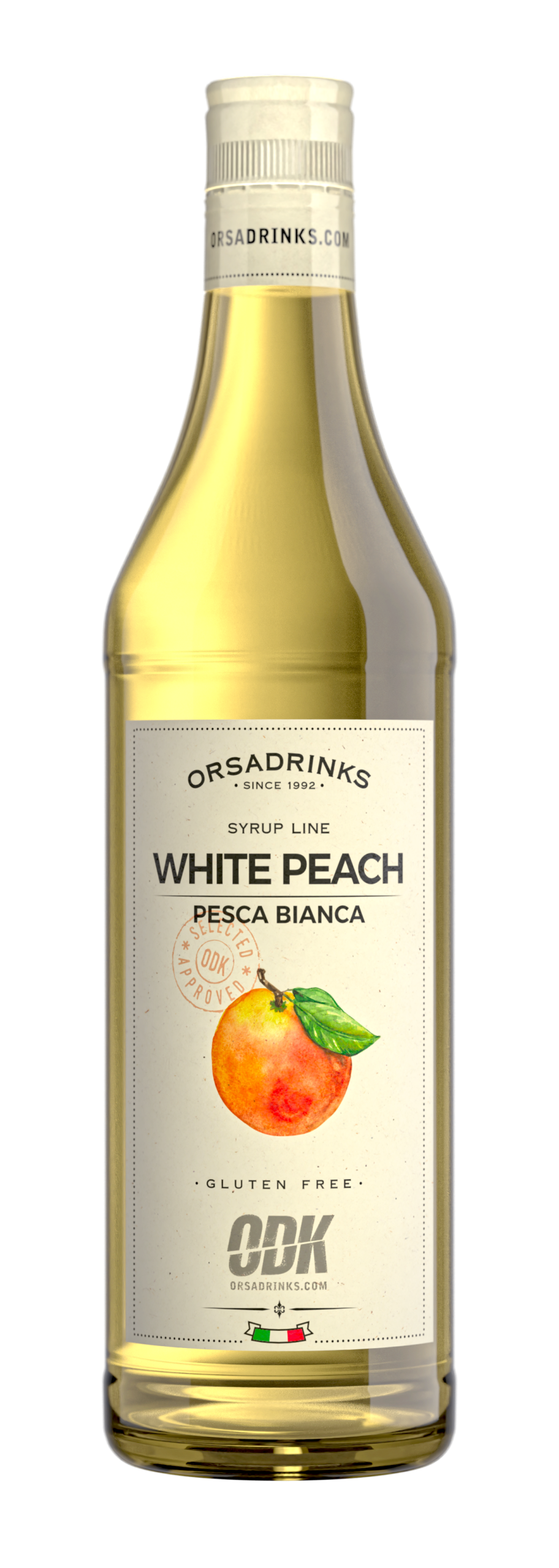 Delicate white peach syrup in a 750ml glass bottle. Subtle, elegant peach flavor for refined cocktails and beverages.